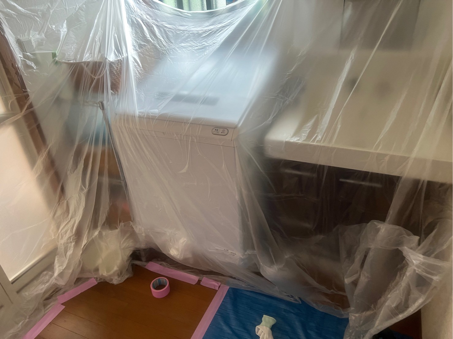 洗濯機や洗面台をしっかりと養生し、通路にもブルーシートを敷設。