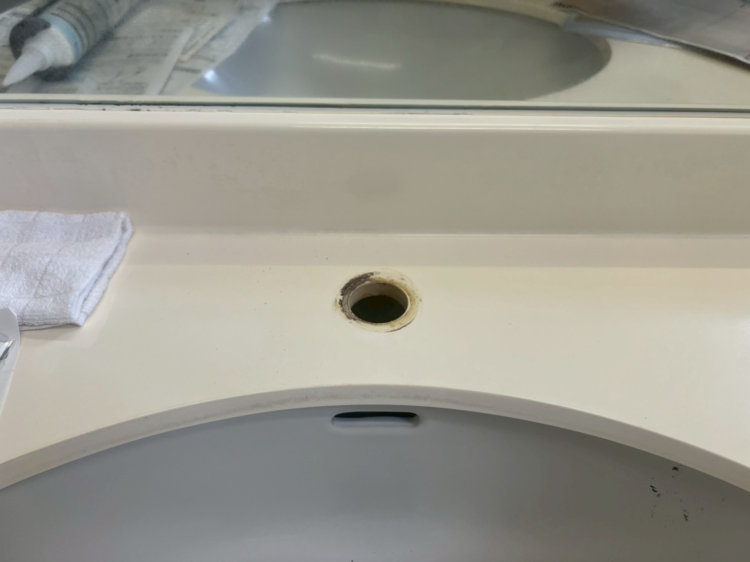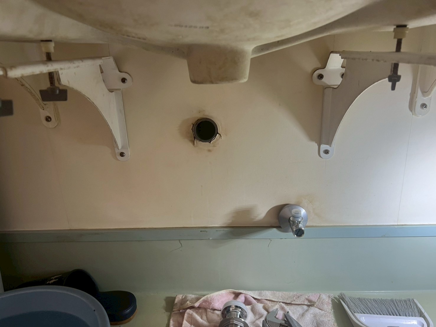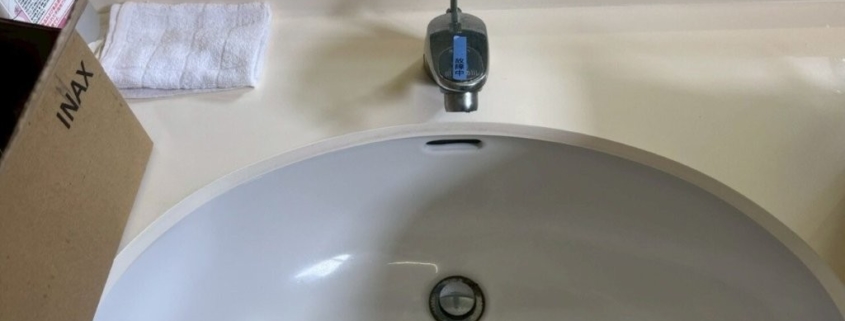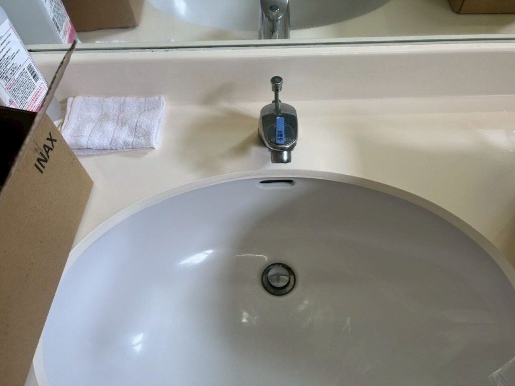 まず既存の水栓本体・制御ユニットを慎重に取り外し、洗面カウンター・シンクの穴まわりの汚れ・劣化部を丁寧に清掃。