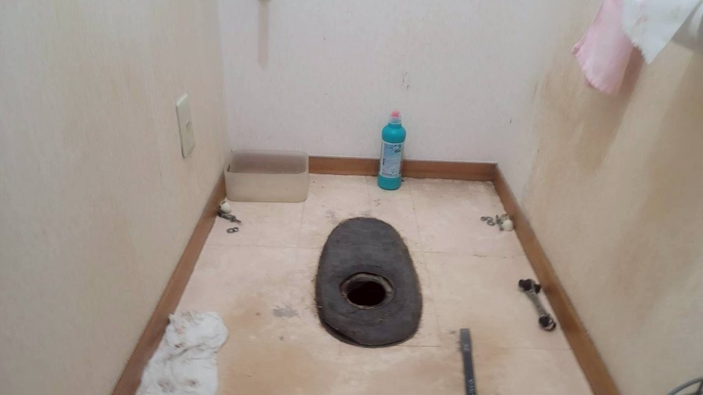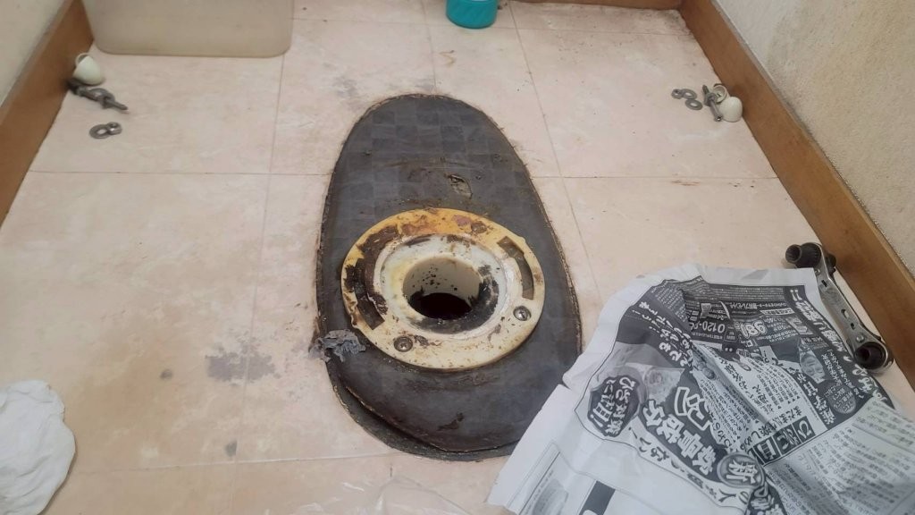 まず便器を慎重に脱着し、床下の排水口まわりを確認しました。