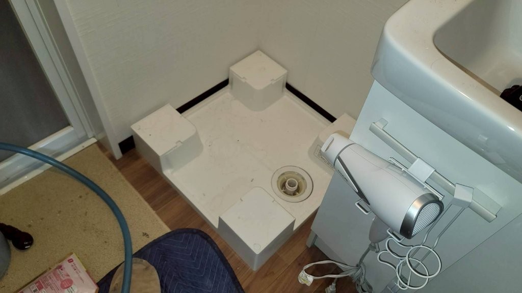 洗濯機まわりを確認したところ、防水パン上では大きな破損は見られませんでしたが、排水時に水の引きが悪く、床下側でのトラブルが疑われる状況でした。