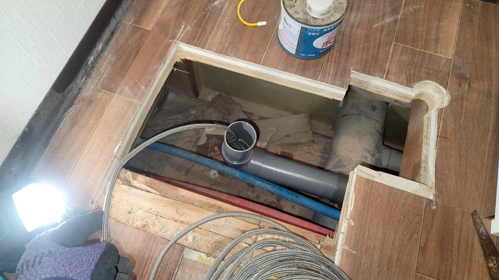 まず洗濯機と防水パンを慎重に取り外し、床を部分的に開口して床下配管を露出しました。