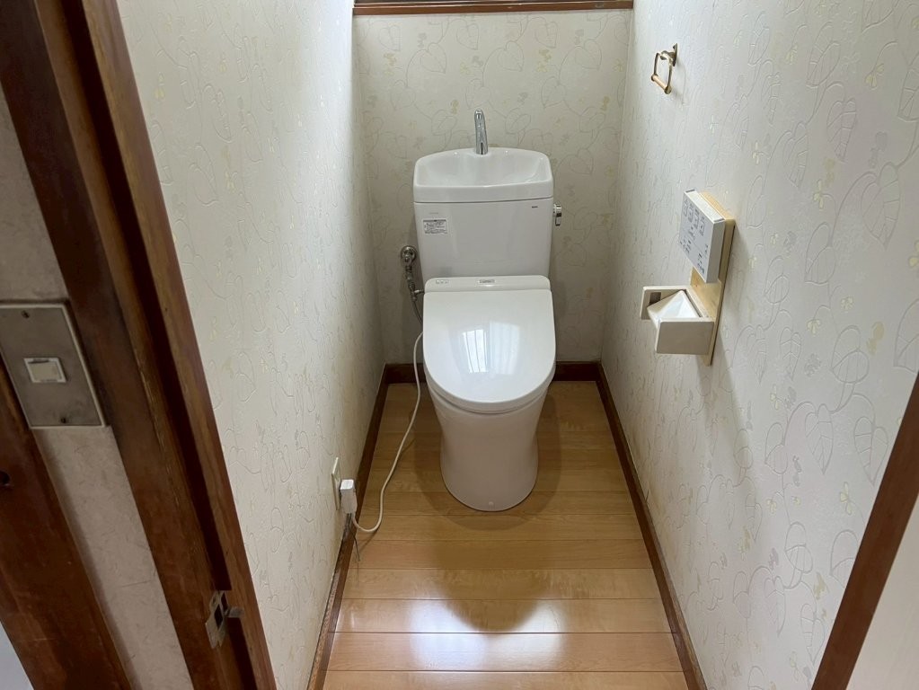 施工後写真では、新しいトイレが設置され、床も張り替えられた状態となっています。