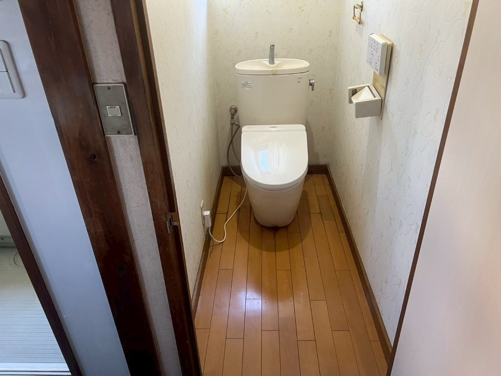 施工前写真では、既存のタンク式トイレが設置されており、床はフローリング仕上げ。
