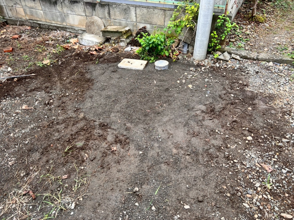 | 施工内容 | ・既存コンクリート排水枡の撤去 ・小口径塩ビ排水枡への交換 ・排水管接続高さの調整 ・排水勾配の再調整 ・埋め戻しおよび整地作業 |